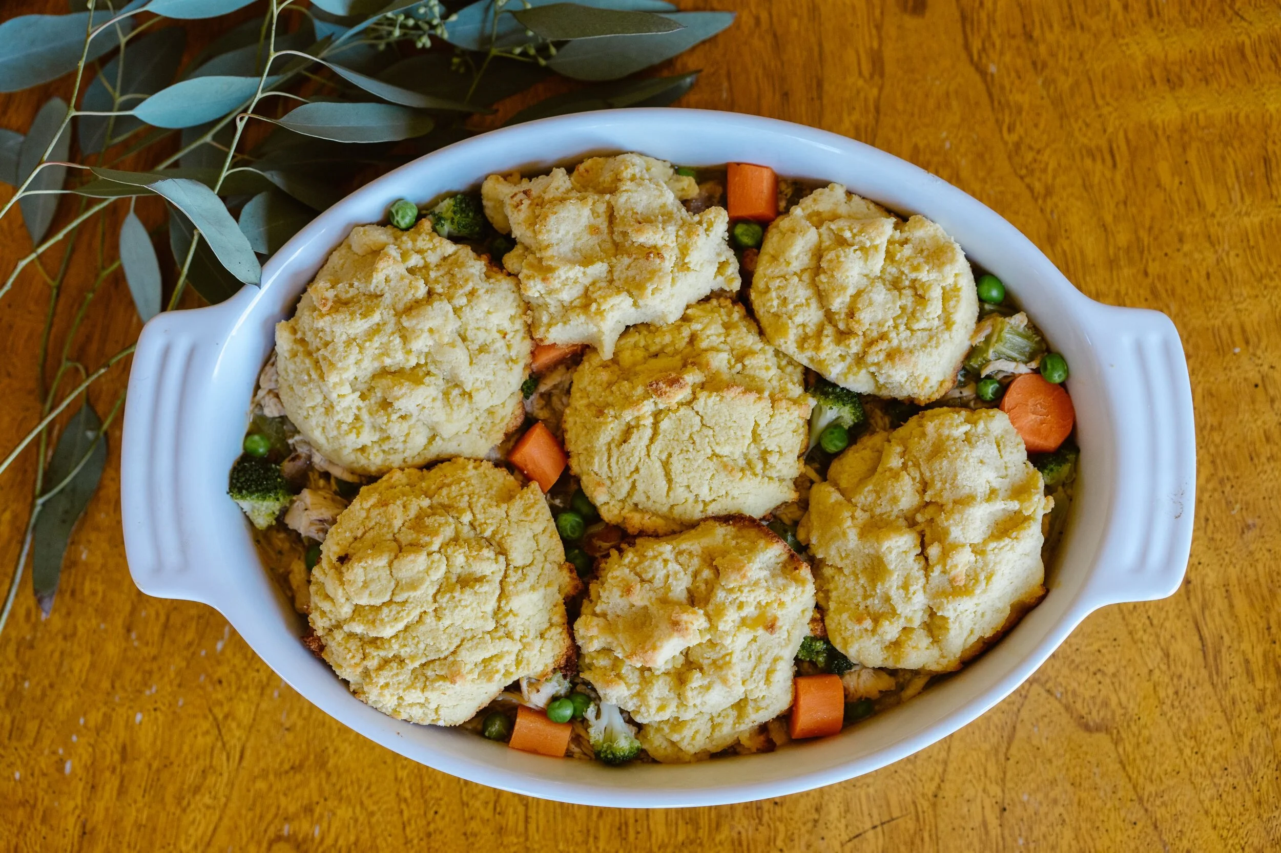 Chicken Pot Pie is one of our favorite comfort foods! This version has the same nostalgic taste, but it is all cleaned up. It’s loaded with vegetables, protein, grain free, dairy free and gluten free. The biscuit topping is flourless and sweetened only with unsweetened applesauce. The biscuit topping recipe can be used for a regular biscuit recipe to go with any of your meals or add to your bread basket!