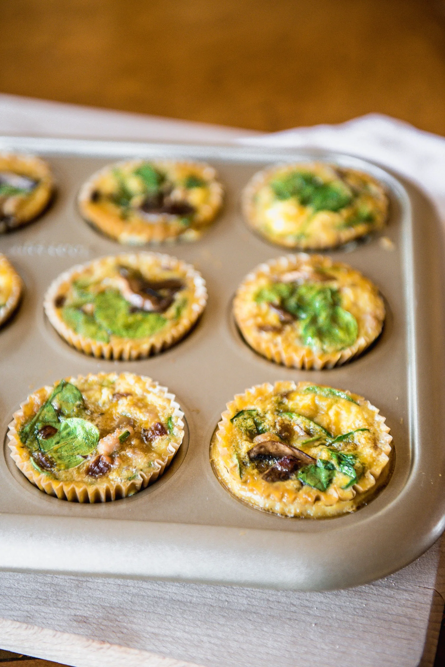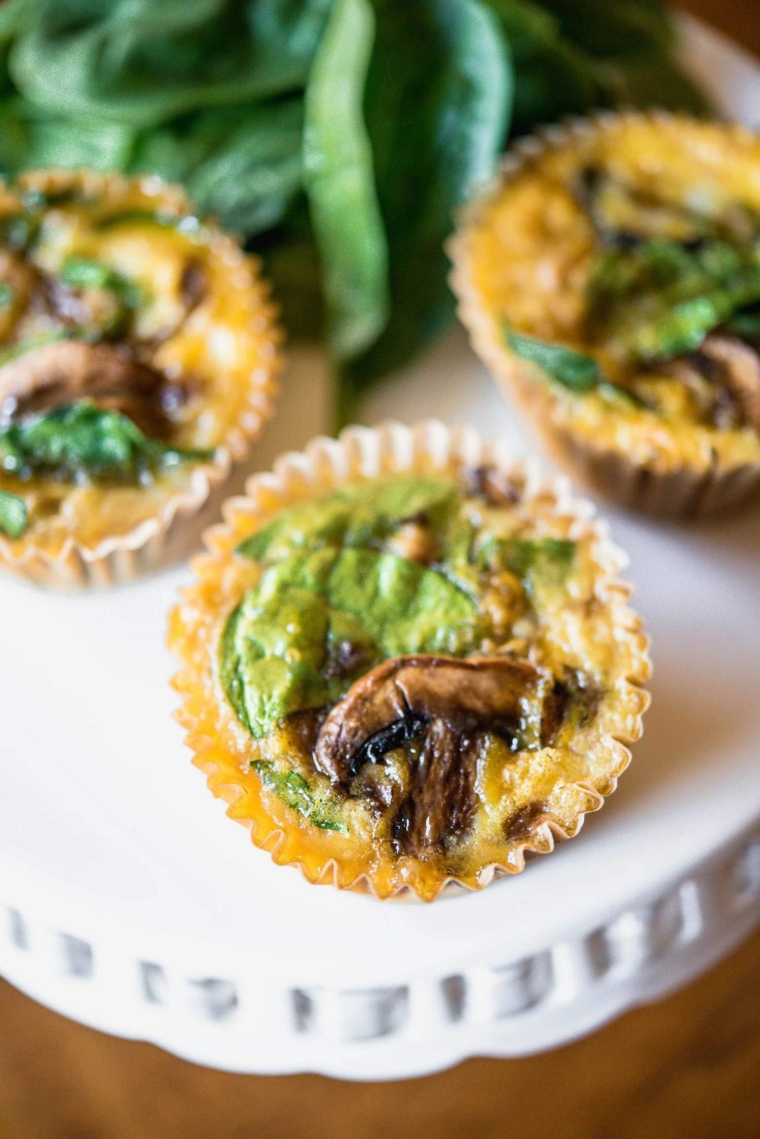 Preheat the oven to 350° and line a muffin tin with parchment liners. Brown the sausage and crumble well, set aside. Whisk the eggs, salt, pepper and seasoning in a large mixing bowl. In a skillet, heat the olive oil and sauté the onion. After a few minutes, add the mushrooms and continuing cooking over medium heat until the vegetables are almost soft. Allow mixture to cool slightly and then add it to the whisked eggs. Add the sausage and the spinach pieces and mix all together. Fill each muffin liner to just below the top rim. Bake for 25 minutes. Makes 12 muffins.