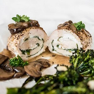 Main Course: Goat Cheese and Spinach Stuffed Chicken with Savory Mushroom Sauce